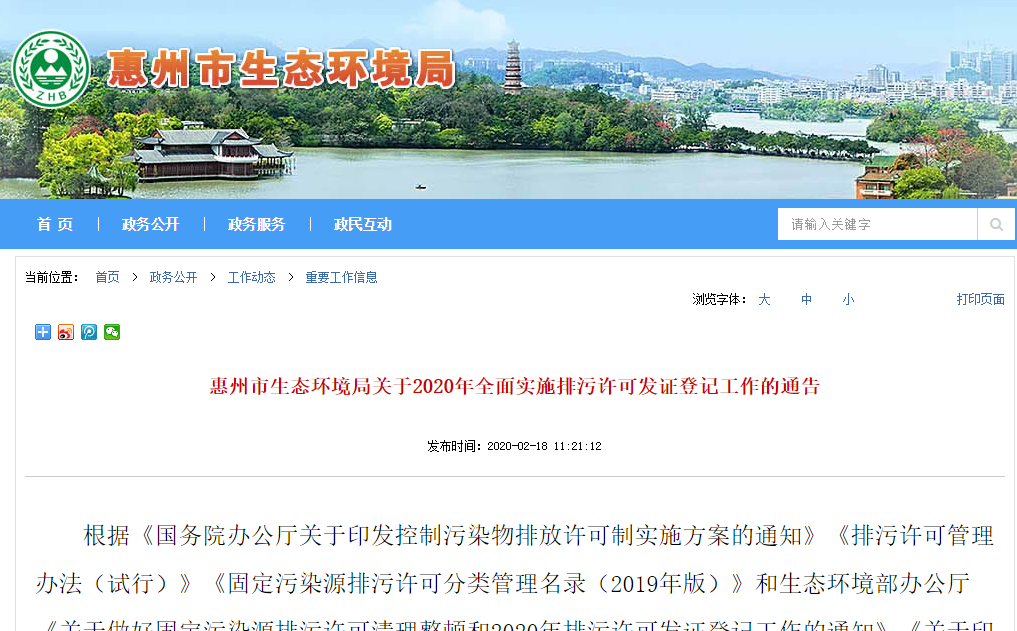 惠州市生態(tài)環(huán)境局關(guān)于2020年全面實(shí)施排污許可發(fā)證登記工作的通告