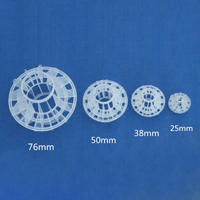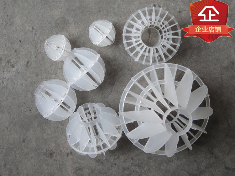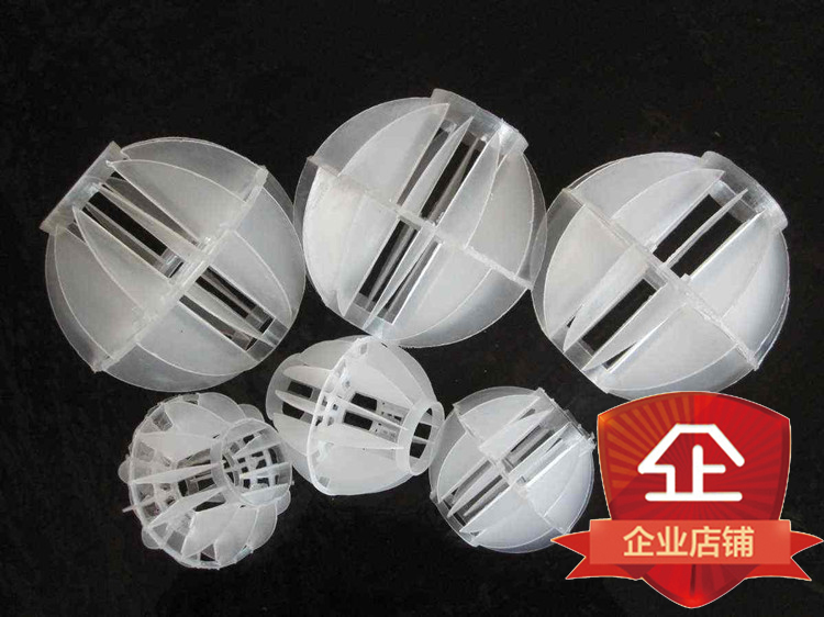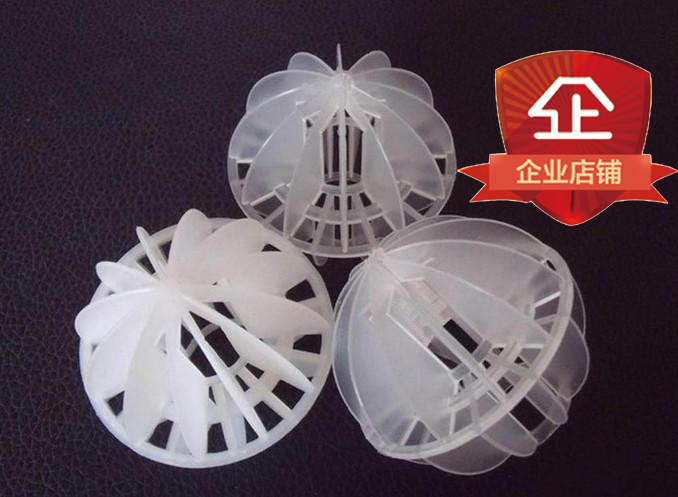 多面空心球采用聚丙烯(PP)塑料制成球狀,由兩個(gè)半球合成一個(gè)球形,兩個(gè)半球的扇形葉片相互錯(cuò)開。該填料特點(diǎn)是比表面積大,空隙率較高。但是由于葉片數(shù)偏多,彼此間有遮蔽效應(yīng),不利于液體分布和潤(rùn)濕;液體大多在球體空心柱聚集,阻礙氣體暢通,因此阻力較大。重量輕、強(qiáng)度高、自由空間大、耐高溫、耐腐蝕、表面親水性能好、風(fēng)阻小、電耗少、比表面積大且適應(yīng)多種溶劑的處理裝置。此種填料多用于水處理工程廣泛應(yīng)用于除氯氣、除氧氣、除二氧化碳吸收塔、廢氣凈化塔、酸霧凈化塔等環(huán)保設(shè)備中。