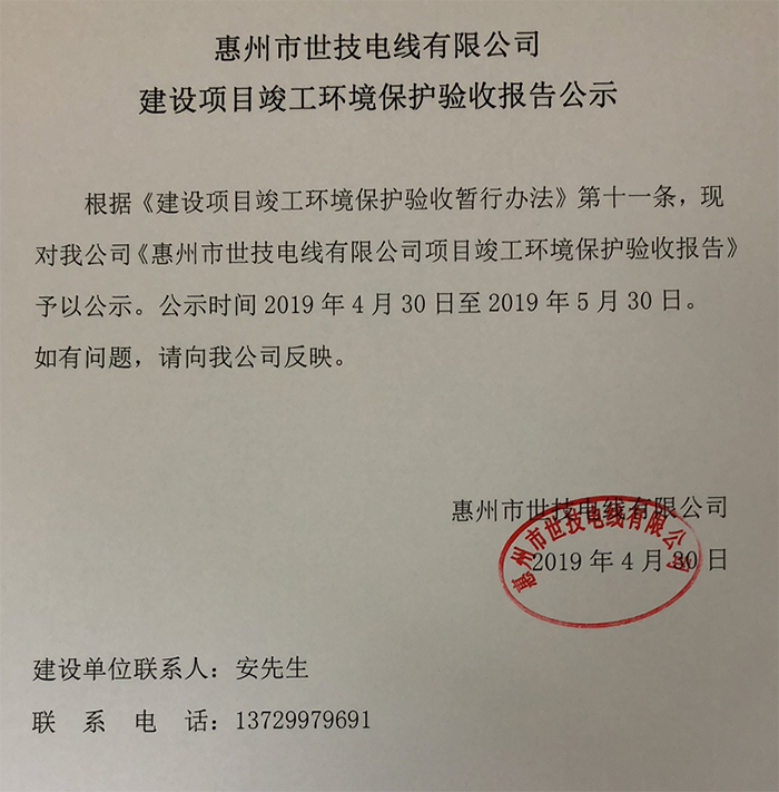 惠州市世技電線有限公司建設項目竣工環(huán)境保護驗收報告公示