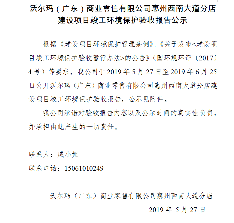 沃爾瑪(廣東)商業(yè)零售有限公司惠州仲愷大道分店 建設項目竣工環(huán)境保護驗收報告公示